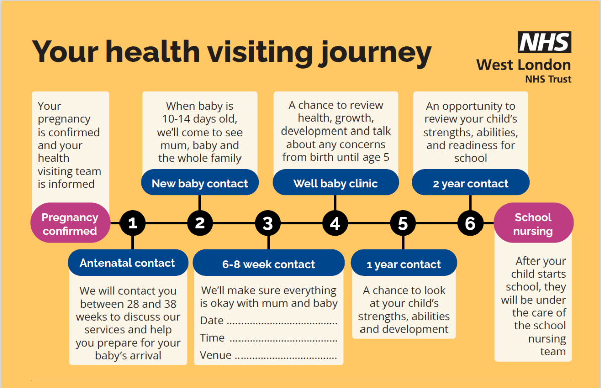 The Health Visiting Team are here to support you and your family up until your child is 5 years of age. We deliver the Healthy Child Programme which provides health advice and parenting support for you and your child. Universal support is offered to every family across Hounslow. Your Health Visitor will see you at the below 5 core contacts: